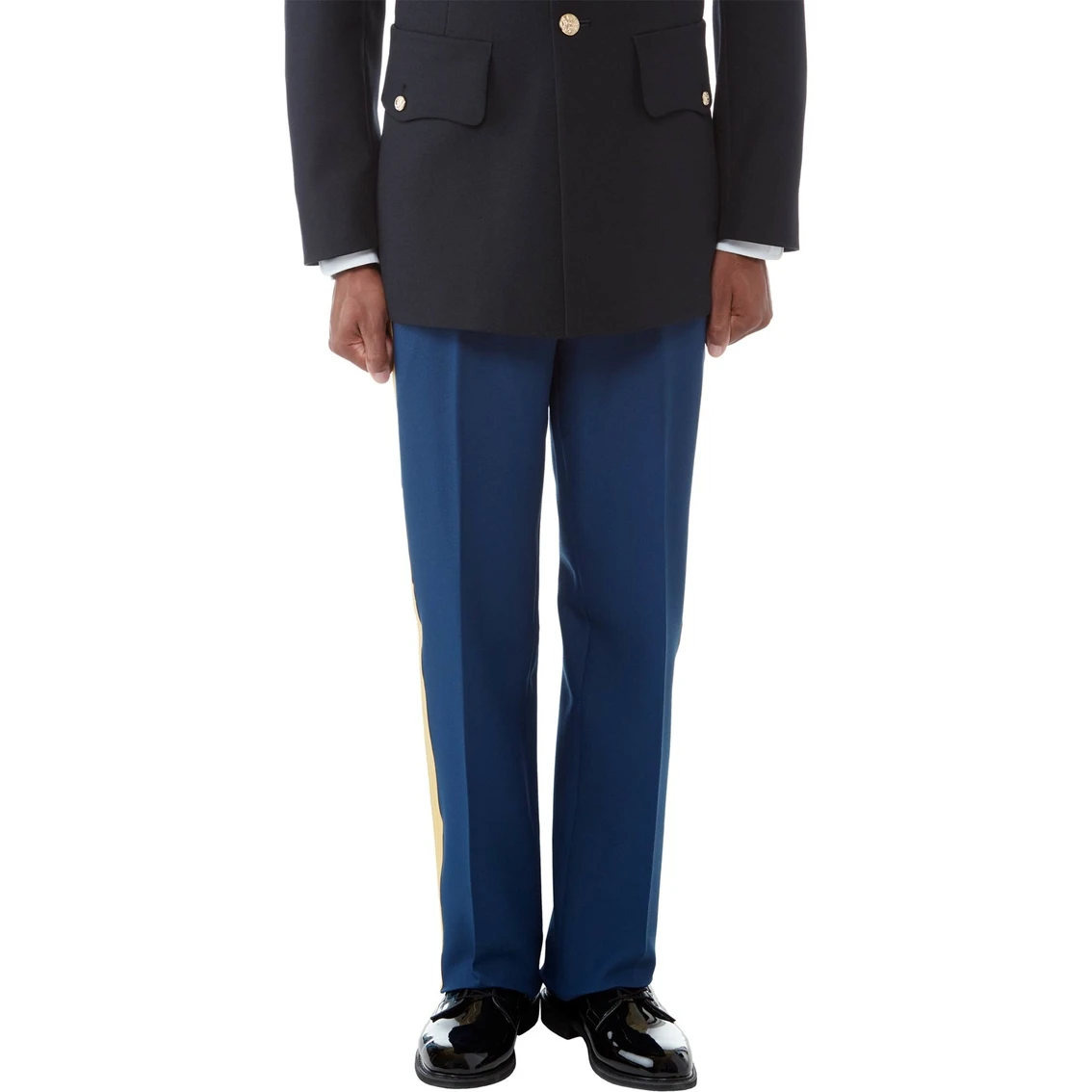 Army Sr. NCO And Officer Trousers with Gold Braid AB 451 (ASU). Commercial version offers heavier, wrinkle-resistant fabric with a regular waist. Only for NCO grades E4 (Cpl) – E9 and Officer grades. Commercial version offers heavier, wrinkle-resistant fabric with a regular waist. Only for NCO grades E4 (Cpl) – E9 and Officer grades. Made of wool and polyester. Dry clean. Made in USA.Color: Army Blue 451. Lengths Sizes